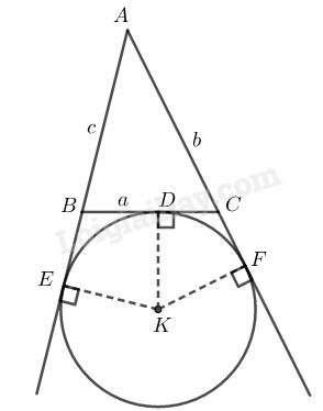Cho tam giác \(ABC,\) đường tròn \((K)\) bằng tiếp góc trong góc \(A\) tiếp xúc với các tia \(AB\) và \(AC\) theo thứ tự tại \(E\) và \(F.\) Cho \(BC = a, AC = b, AB = c.\) Chứng minh rằng: