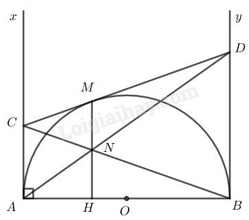 Cho nửa đường tròn tâm \(O\) có đường kính \(AB.\) Vẽ các tiếp tuyến \(Ax, By\) \((Ax, By\) và nửa đường tròn thuộc cùng một nửa mặt phẳng bờ \(AB).\) Qua một điểm \(M\) thuộc nửa hình tròn, kẻ tiếp tuyến thứ ba cắt \(Ax,\) \(By\) theo thứ tự ở \(C, D.\) Gọi \(N\) là giao điểm của \(AD\) và \(BC, H\) là giao điểm của \(MN\) và \(AB.\) Chứng minh rằng: