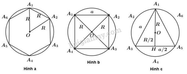 Vẽ các hình lục giác đều, hình vuông, hình tam giác đều cùng nội tiếp đường tròn \((O;R)\) rồi tính cạnh của các hình đó theo \(R\).