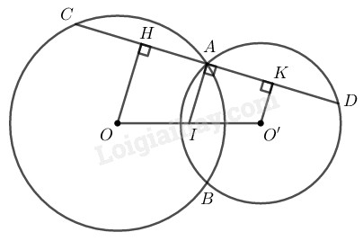 Cho hai đường tròn \((O)\) và \((O’)\) cắt nhau tại \(A\) và \(B.\) Gọi \(I\) là trung điểm của \(OO’.\) Qua \(A\) vẽ đường thẳng vuông góc với \(IA,\) cắt các đường tròn \((O)\) và \((O’)\) tại \(C\) và \(D\) (khác \(A\)). Chứng minh rằng \(AC = AD.\)