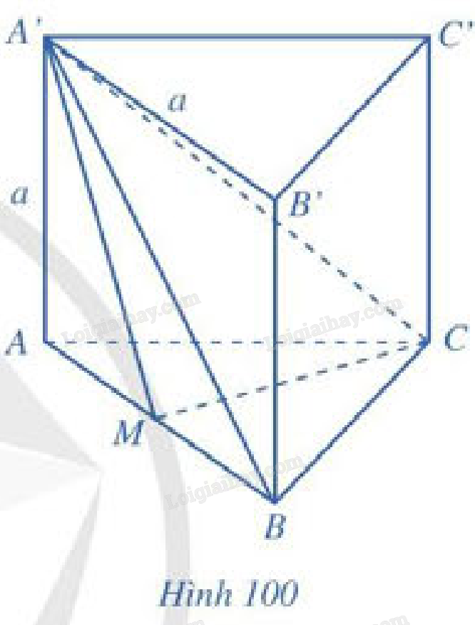 Cho hình lăng trụ tam giác đều \(ABC.A'B'C'\) có tất cả các cạnh bằng \(a\). Gọi \(M\) là trung điểm của \(AB\) (Hình 100).
