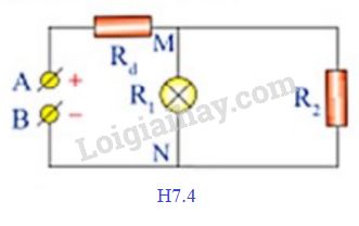 Mạch điện có sơ đồ như hình H7.4, hiệu điện thế giữa hai đầu A, B của mạch điện là U = 220V. Dây nối từ  A đến M và từ B đến N là dây đồng có điện trở suất \(\rho  = 1,{7.10^{ – 8}}\,\,\Omega .m\), chiều dài tổng cộng là \(l = 400m\)  được biểu diễn bằng điện trở Rd trên sơ đồ. Bóng đèn có điện trở \({R_1} = 720\,\Omega \), bếp điện có điện trở \({R_1} = 80\,\Omega \). Bỏ qua điện trở của dây nối từ M, N đến bóng đèn, bếp điện. Đường kính tiết diện của các dây AM, BN phải là bao nhiêu để hiệu điện thế hai đầu bóng đèn, bếp điện không nhỏ hơn 210V?