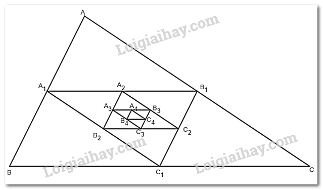 Cho một tam giác đều ABC cạnh \(a\). Tam giác \({A_1}{B_1}{C_1}\) có các đỉnh là trung điểm các cạnh của tam giác ABC, tam giác \({A_2}{B_2}{C_2}\) có các đỉnh là trung điểm các cạnh của tam giác \({A_1}{B_1}{C_1}, \ldots \), tam giác \({A_{n + 1}}{B_{n + 1}}{C_{n + 1}}\) có các đỉnh là trung điểm các cạnh của tam giác \({A_n}{B_n}{C_n}, \ldots \)