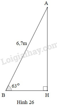 Thang AB dài \(6,7m\) tựa vào tường làm thành góc \(63^\circ \) với mặt đất (h.26). Hỏi chiều cao của thang đạt được so với mặt đất ?