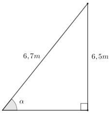– Gọi \(\alpha\) là góc tạo bởi cái thang và mặt đất, ta tìm \(\sin\alpha\) bằng cách lấy \(6,5\) chia cho \(6,7\) (cạnh đối chia cạnh huyền), từ đó tìm được góc \(\alpha\).