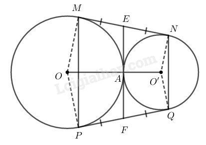 Cho hai đường tròn \((O)\) và \((O’)\) tiếp xúc ngoài tại \(A.\) Kẻ tiếp tuyến chung ngoài \(MN\) với \(M\) thuộc \((O)\) và \(N\) thuộc \((O’).\) Gọi \(P\) là điểm đối xứng với \(M\) qua \(OO’, Q\) là điểm đối xứng với \(N\) qua \(OO’.\) Chứng minh rằng: