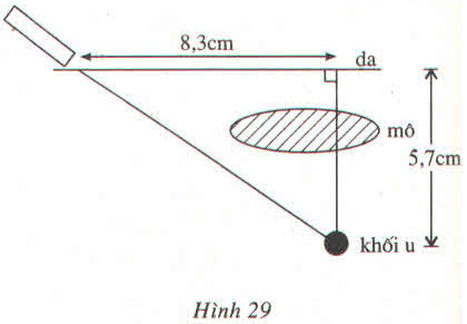 Một khối u của một căn bệnh nhân cách mặt da \(5,7cm\), được chiếu bởi một chùm tia gamma. Để tránh làm tổn thương mô, bác sĩ đặt nguồn tia cách khối u (trên mặt da) \(8,3cm\) (h.29).