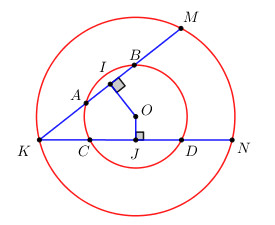 Xét \(\left( {O;OK} \right)\) có \(OI \bot KM,\,\,OJ \bot KN\), lại có \(OI > OJ\,\,\left( {cmt} \right) \Rightarrow KM < KN\) (trong một đường tròn, dây nào xa tâm hơn thì ngắn hơn).