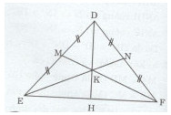 Mà \(\widehat {DEN} = \widehat {DFM}(\Delta DEN = \Delta DFM)\)  . Do đó: \(\widehat {KEF} = \widehat {KFE}.\)