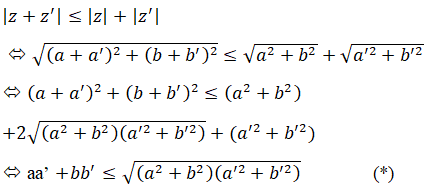 Theo Bu-nhi-cốp-xki ta có bất đẳng thức (*) đúng với a,b,a’,b’R nên |z+z’| ≤ |z|+|z’| (đpcm)