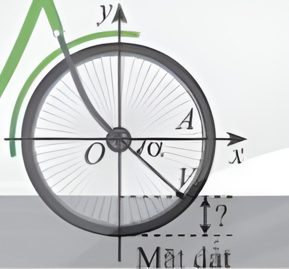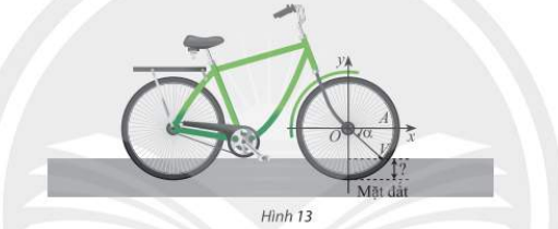 Khi xe đạp di chuyển, van V của bánh xe quay quanh trục O theo chiều kim đồng hồ với tốc độ góc không đổi là 11 rad/s (Hình 13). Ban đầu van nằm ở vị trí A. Hỏi sau một phút di chuyển, khoảng cách từ van đến mặt đất là bao nhiêu, biết bán kính OA = 58cm? Giả sử độ dày của lốp xe không đáng kể. Kết quả làm trong đến hàng phần mười.