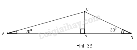 Tam giác ABC có \(\hat A = 20^\circ ,\widehat B = 30^\circ ,AB = 60cm\). Đường vuông góc kẻ từ C đến AB cắt AB tại P. (h.33).