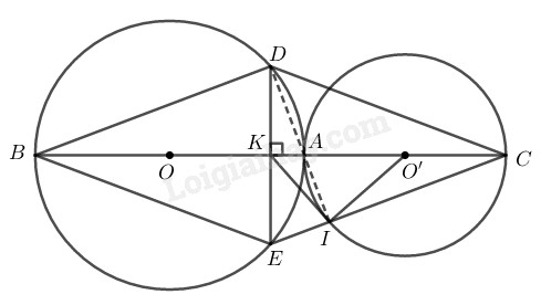 Cho hai đường tròn \((O ; R)\) và \((O’ ; R’)\) tiếp xúc ngoài tại \(A ( R > R’).\) Vẽ các đường kính \(AOB, AO’C.\) Dây \(DE\) của đường tròn \((O)\) vuông góc với \(BC\) tại trung điểm \(K\) của \(BC.\)