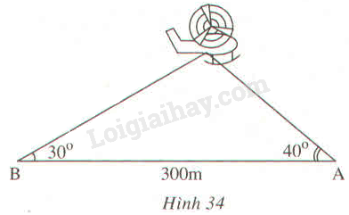 Điểm hạ cánh của một máy bay trực thăng ở giữa hai người quan sát A và B. Biết khoảng cách giữa hai người này là 300m, góc “nâng” để  nhìn thấy máy bay tại vị trí A là \(40^\circ \) và tại vị trí B là \(30^\circ \) (h.34). Hãy tìm độ cao của máy bay.