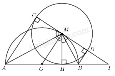 Cho nửa đường tròn tâm \(O\) có đường kính \(AB.\) Gọi \(M\) là điểm bất kì thuộc nửa đường tròn, \(H\) là chân đường vuông góc kẻ từ \(M\) đến \(AB.\) Vẽ đường tròn \((M ; MH).\) Kẻ các tiếp tuyến \(AC, BD\) với đường tròn tâm \(M ( C\) và \(D\) là các tiếp điểm khác \(H).\)