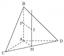 \(IA = IB = IC\) \( \Rightarrow I\) nằm trên trục của đường tròn ngoại tiếp tam giác \(ACD\). Tam giác \(ACD\) vuông tại đỉnh \(A\) nên trục của đường tròn ngoại tiếp tam giác \(ACD\) là đường thẳng vuông góc với mp \((ACD)\) và đi qua trung điểm \(M\) của cạnh huyền \(CD\).