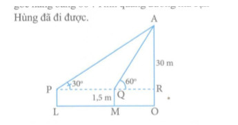 Bạn Hùng có tầm mắt cao 1,5 m đang đứng gần một cao ốc cao 30 m thì nhìn thấy nóc tòa nhà với góc nâng \({30^o}\). Hùng đi về phía tòa nhà cho đến khi nhìn tháy nóc tòa nhà với góc nâng bằng \({60^o}\). Tính quãng đường mà bạn Hùng đã đi được.