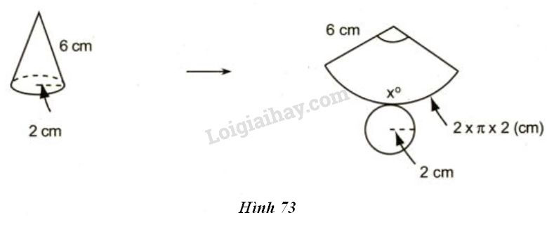 Cắt mặt xung quanh của hình nón theo một đường sinh và trải phẳng ra thành một hình quạt. Biết bán kính hình quạt tròn bằng độ dài đường sinh và độ dài cung bằng chu vi đáy. Quan sát hình 73 và tính số đo cung của hình quạt tròn.