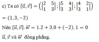 Để xét tính đồng phẳng của \(\overrightarrow u ,\overrightarrow v \)  và \(\overrightarrow w \)  ta xét \(\left[ {\overrightarrow u ,\overrightarrow v } \right].\overrightarrow w \)