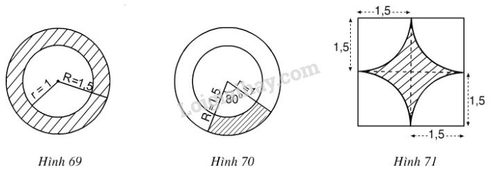 Hãy tính diện tích miền gạch sọc trong các hình 69, 70, 71 (đơn vị độ dài: cm).