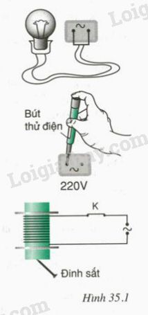Hãy mô tả hiện tượng xảy ra trong mỗi thí nghiệm ở hình 35.1 và cho biết hiện tượng nào chứng tỏ dòng điện xoay chiều có tác dụng nhiệt, tác dụng quang, tác dụng từ.