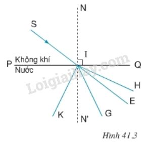 Ở hình 41.3, SI là tia tới. Tia khúc xạ của tia này trùng với một trong số các đường IH, IE, IG, IK. Hãy điền dấu mũi tên vào tia khúc xạ đó.