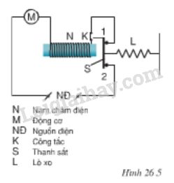 Hình 26.5 mô tả cấu tạo của một role dòng, là loại role mắc nối tiếp với thiết bị cần bảo vệ. Bình thường, khi dòng điện qua động cơ điện ở mức cho phép thì thanh sắt S bị lò xo L kéo sang phải làm đóng các tiếp điểm 1, 2. Động cơ làm việc bình thường. Giải thích vì sao khi dòng điện qua động cơ tăng quá mức cho phép thì mạch điện tự động ngắt và động cơ ngừng làm việc ?