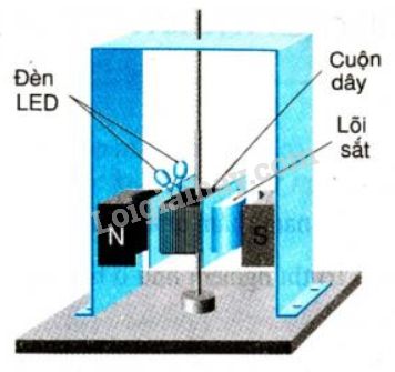 Trên hình 33.4 vẽ một cuộn dây dẫn kín có thể quay trong từ trường của một nam châm. Hai đèn LED khác nhau, mắc song song ngược chiều vào hai đầu cuộn dây tại cùng một vị trí. Khi cho cuộn dây quay, hai bóng đèn bật sáng, vạch ra hai nửa vòng sáng đối diện nhau. Giải thích tại sao mỗi bóng đèn chỉ sáng trên nửa vòng tròn.