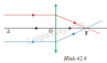 Trong thí nghiệm ở hình 42.2 SGK, điểm hội tụ F của chùm tia ló nằm trên trục chính, đó là đường thẳng chứa tia tới ở giữa.