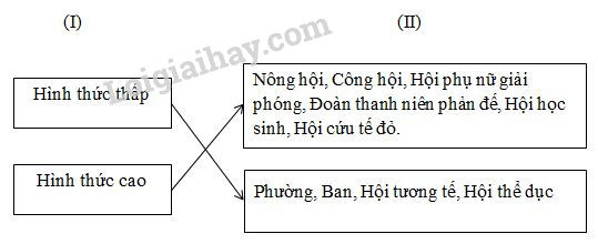 Cột I ghi hình thức tổ chức, cột II ghi các tổ chức quần chúng. Hãy nối cột I sang cột II sao cho phù hợp: