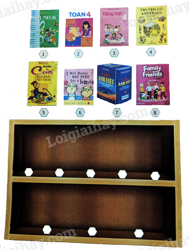 Bên dưới là những tên sách cần được sắp xếp hợp lí trước khi đặt vào giá sách. Em hãy phân chia chúng vào từng ngăn hợp lí để thuận tiện cho việc tìm kiếm.