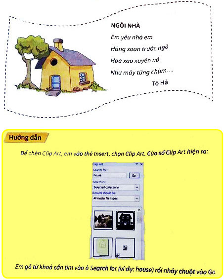 Em hãy chèn hình ảnh từ Clip Art vào trích đoạn bài thơ sau. Vị trí chèn và trình bày như mẫu.