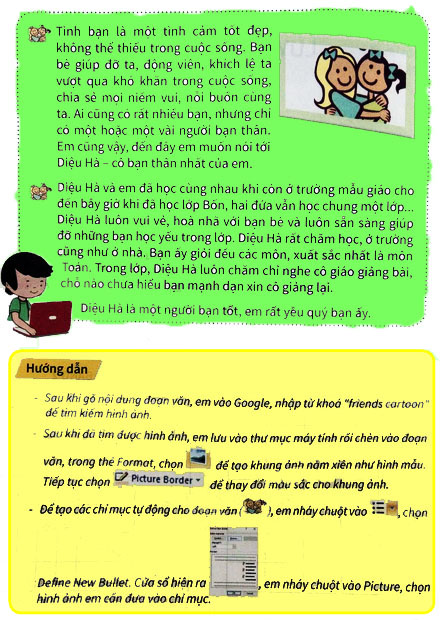 Giải phần bài tập vận dụng, mở rộng trang 58 sách bài tập hướng dẫn học Tin học 4. Gõ nội dung đoạn văn miêu tả về tình bạn và trình bày lại theo mẫu sau …