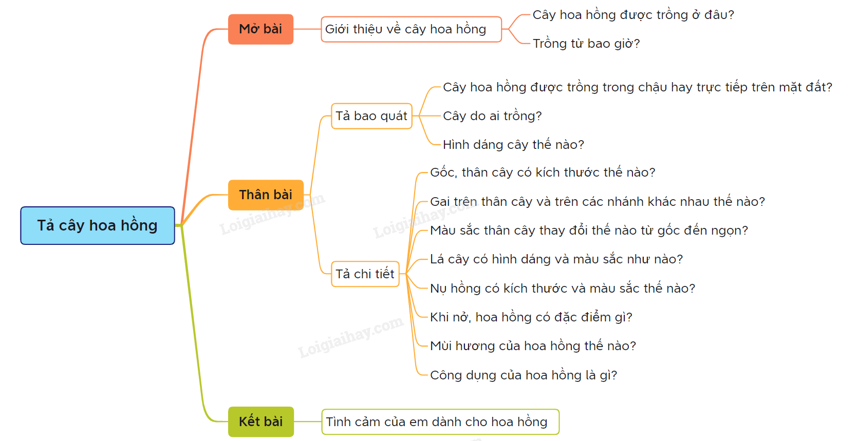 Từ thân cây mọc ra rất nhiều cành nhỏ và từ những cành nhỏ rất nhiều nụ hồng mọc ra. Nụ hồng lúc bé có màu xanh, khi lớn dần lên, cánh hồng bắt đầu lộ ra. Trông nụ hồng lúc bé thật là đẹp, đáng yêu. Cánh hồng mềm, mịn như nhung, được xếp vòng quanh trông như một cô công chúa mặc một chiếc vày nhiều tầng. Hoa hồng có rất nhiều màu sắc như: đỏ, vàng, da cam, trắng, hồng…Bên cạnh màu sắc sặc sỡ của hoa hồng là chiếc lá nhỏ hình bầu dục có răng cưa làm nổi bật lên những bông hồng nhiều màu sắc. Hoa hồng đẹp được ví như nữ hoàng của các loài hoa. Hương hoa hồng không quá nồng, nhưng nó thoang thoảng, dễ chịu, đẳng cấp. Nên hoa hồng thường được người ta tặng nhau và còn là biểu tượng của tình yêu, tình bạn cao đẹp.
