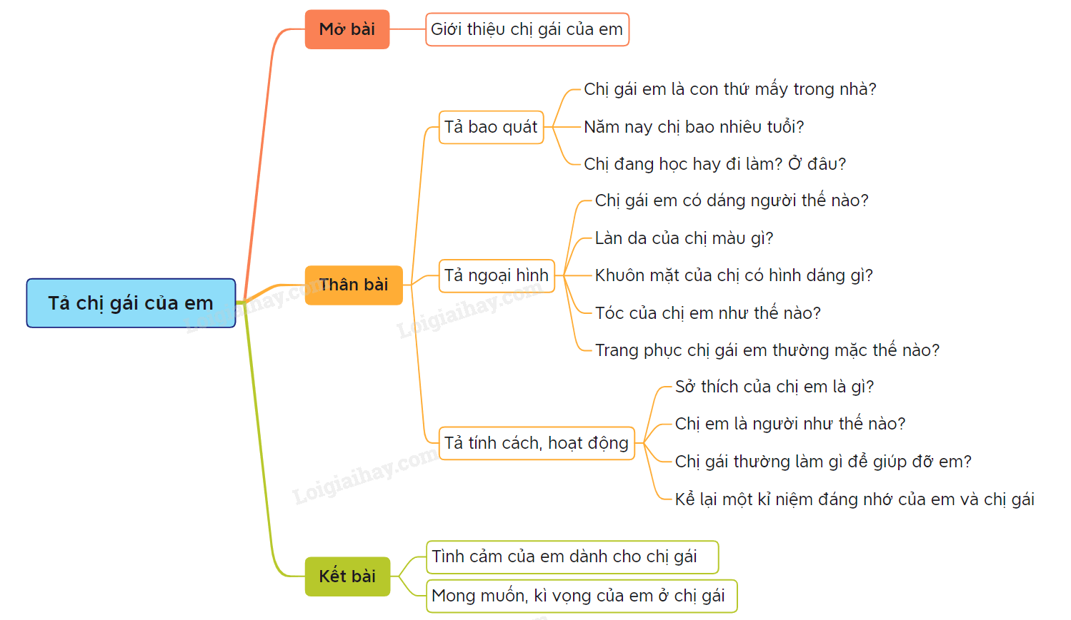 Chị em có khuôn mặt hình trái xoan. Đôi mắt của chị to, tròn và còn óng ánh. Tóc chị ngắn đến ngang vai và mượt mà. Chị có một làn da trắng trẻo. Vóc người của chị dong dỏng. Chị là một người dịu dàng, chăm chỉ, cần cù, nhanh nhẹn. Chị như là một người cô giáo thứ hai của em. Mỗi khi có bài khó, em thường hỏi chị. Chị chỉ mất vài giây suy nghĩ là đã chỉ cho em rất dễ hiểu.