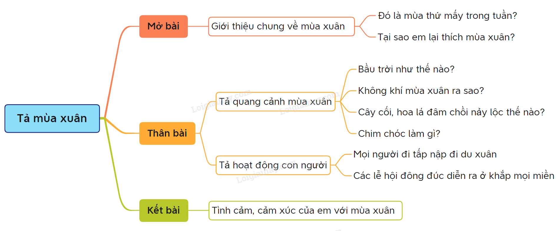 Gió nhè nhẹ thổi, ánh nắng ửng hồng, mang theo không khí xuân ấm áp. Em bước ra vườn khoan khoái hít thở không khí trong lành của buổi sớm mai. Trên những chậu kiểng trước sân, những giọt sương long lanh như hạt kim cương đọng trên những chiếc lá xanh mướt. Mưa xuân như rắc bụi, cây cỏ hoa lá hân hoan rạo rực đón mừng. Nhìn lên ngọn đồi trước mặt, em thấy cỏ non tua tua mọc lên, chồi non trong vườn hé mắt khoe màu xanh nõn. Hoa thược dược, hoa mẫu đơn, hoa hồng thi nhau khoe sắc thắm. Trên những luống hoa có nhiều bướm vàng và chuồn chuồn bay lượn rập rờn. Đâu đâu cũng thấy hương hoa, hương của đất trời, thơm đến xao xuyến lòng người. Trên các dòng sông, dòng kênh, lòng máng nước trong vắt, dâng đầy như cùng mùa xuân đem phù sa tưới tắm cho những cánh đồng thêm xanh. Lúa, ngô, khoai xanh một màu trải rộng đến tận chân trời.