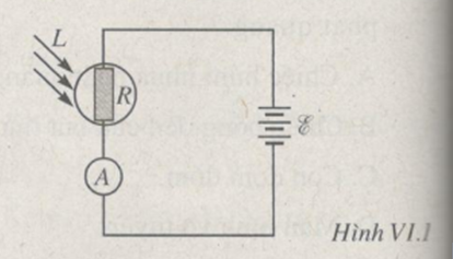 Trên Hình VI.1, ta có \(\xi :\) bộ pin \(12V – 1\Omega ;\) có thể là một ampe kế hoặc micrôampe kế; \(R\) là một quang điện trở; \(L\) là chùm sáng thích hợp chiếu vào quang điện trở.