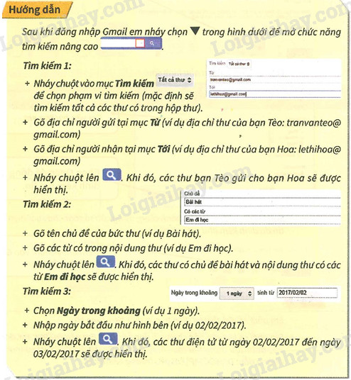 – Tìm kiếm thư có chủ đề cụ thể, ví dụ: học tập, văn nghệ, thể thao… trong hộp thư của em.