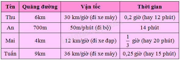 Em hỏi các bạn trong tổ quãng đường từ nhà đến trường, vận tốc đi rồi tính thời gian đi từ nhà đến trường của mỗi bạn và điền vào bảng theo mẫu sau :