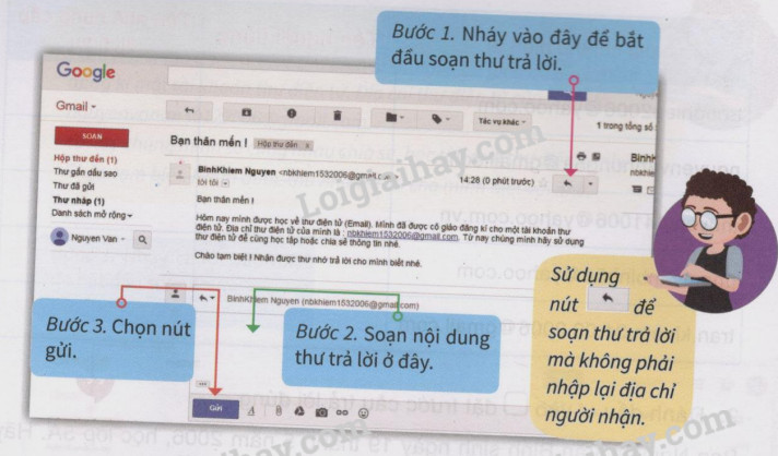 Đăng nhập vào hộp thư của em, đọc lại thư của bạn vừa gửi rồi gửi thư trả lời cho bạn.