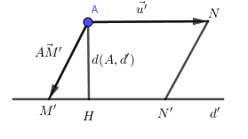 \(d\left( {A,d’} \right) = \dfrac{{{S_{ANN’M’}}}}{{AN}} = \dfrac{{\left| {\left[ {\overrightarrow {AM’} ,\overrightarrow {u’} } \right]} \right|}}{{\left| {\overrightarrow {u’} } \right|}}\)