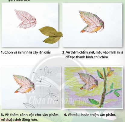 Quan sát và chỉ ra cách tạo bức tranh về  chú chim bằng cách in chà xát từ lá cây theo gợi ý dưới đây:
