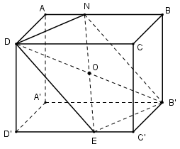 Gọi O là giao điểm hai đường chéo B’D và NE của hình bình hành DNB’E suy ra O là trung điểm của B’D. Do đó O là tâm hình hộp ABCD.A’B’C’D’.