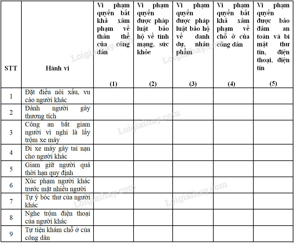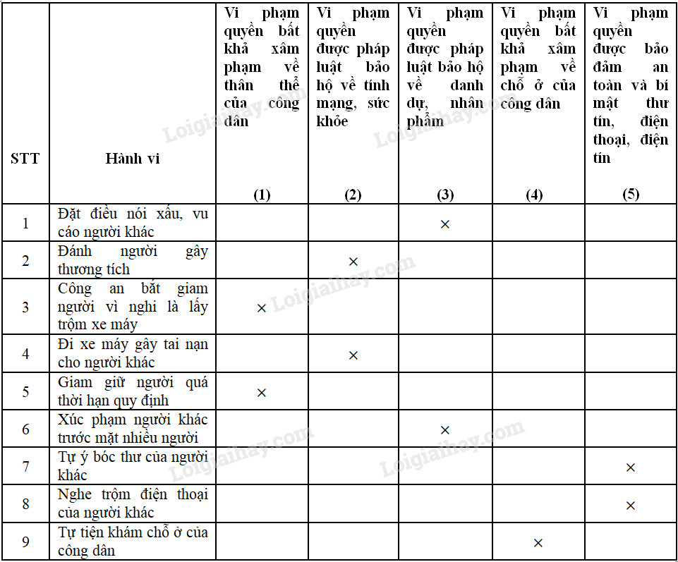 Đánh dấu × vào các cột tương ứng với các hành vi vi phạm pháp luật dưới đây: