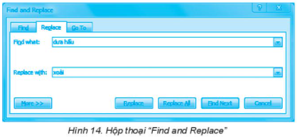 Quan sát các lệnh sau có trong hộp thoại “Find and Replace” (Hình 14).