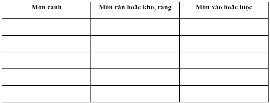 Kể tên một số món ăn thường dùng trong gia đình em theo mỗi loại dưới đây