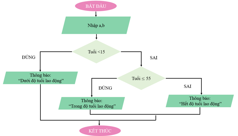 Nếu tuổi < 15 thì thông báo “Dưới độ tuổi lao động”.