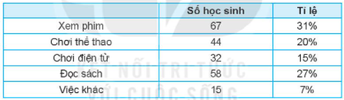 Các bạn An, Minh, Khoa thực hiện khảo sát về việc sử dụng quỹ thời gian hằng ngày sau giờ học. Phiếu được phát ra cho 216 học sinh trong trường. Sau khi thu phiếu và tổng hợp lại các bạn có kết quả như sau: