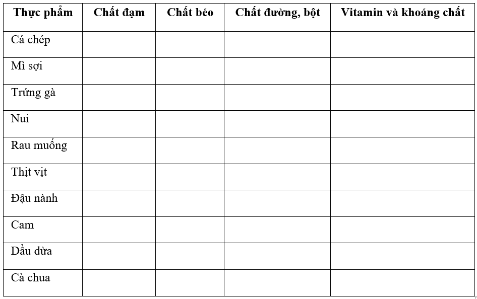 Đánh dấu √ vào cột thể hiện chất dinh dưỡng chính trong các loại thực phẩm sau