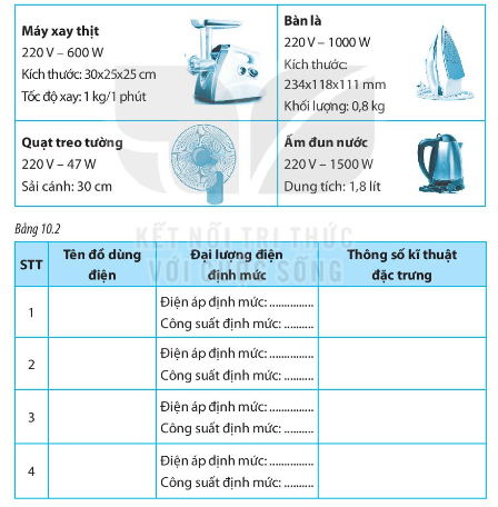 Hãy đọc thông tin dưới đây rồi điền: tên, đại lượng điện định mức và thông số kĩ thuật đặc trưng của mỗi đồ dùng điện trong Bảng 10.2
